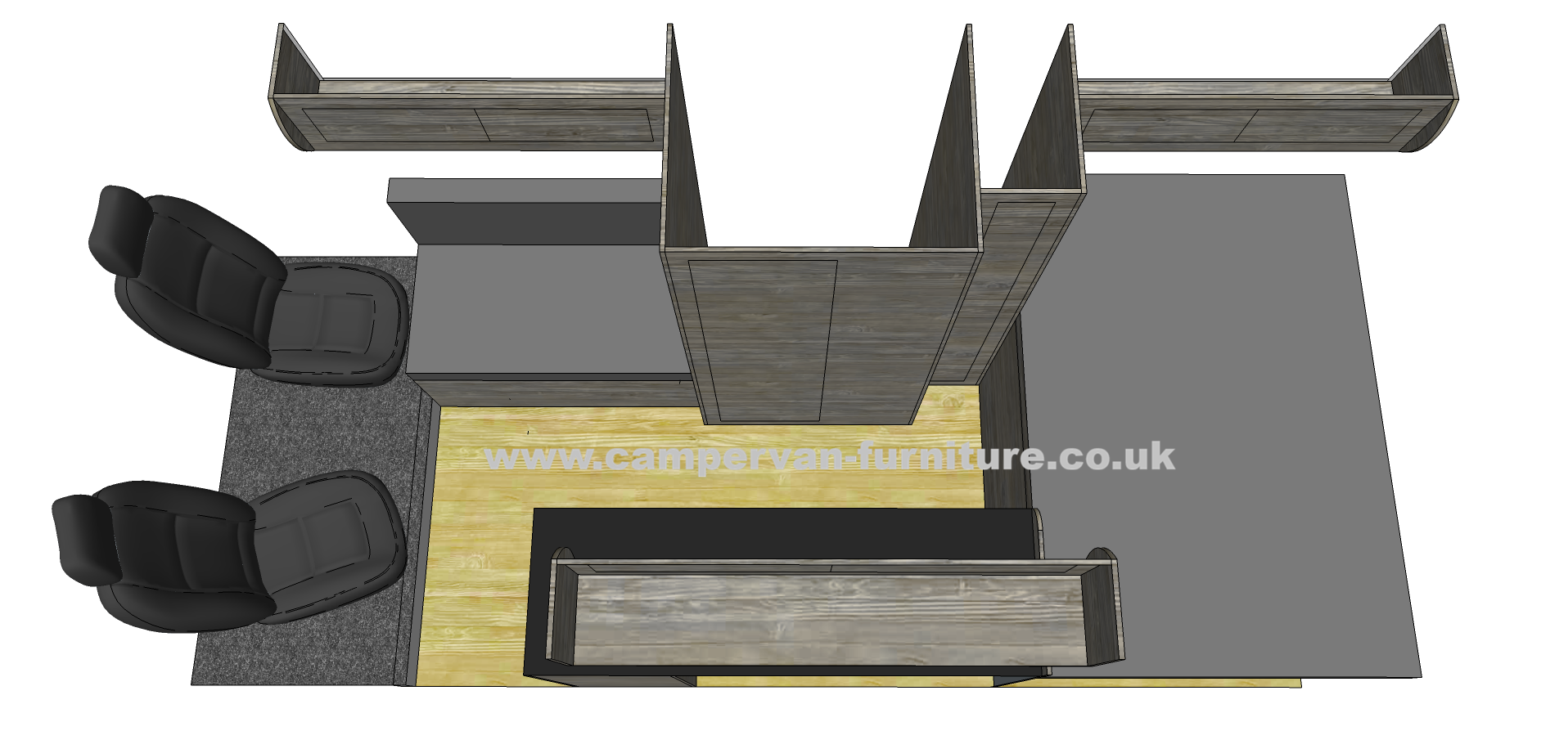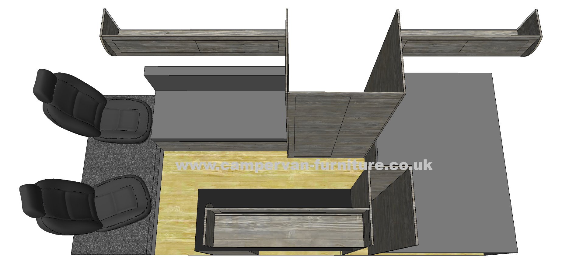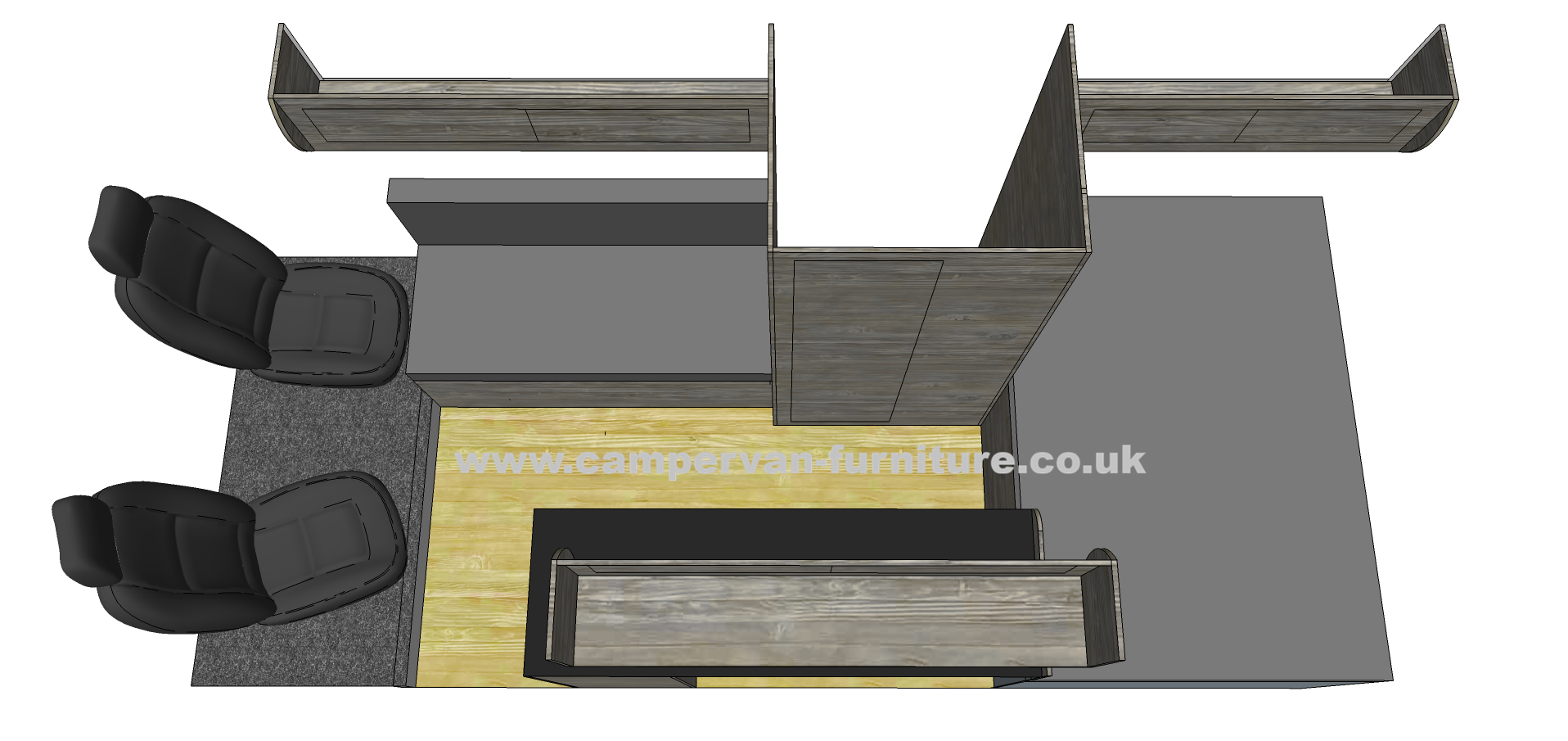 This 5 berth layout is another tried and tested one here at Campervan Furniture Ltd, we had this layout in one of our own personal campers and used it for a couple of years. It's a very practical design with 2 double beds and raised rear bed giving large garage/boot area. The two separate seating areas can also be very useful and also make the living area feel very spacious. Based on the L4 Relay/Boxer/Ducato vans with over 6 foot width ensuring good sized beds, can also be adapted to other vans.